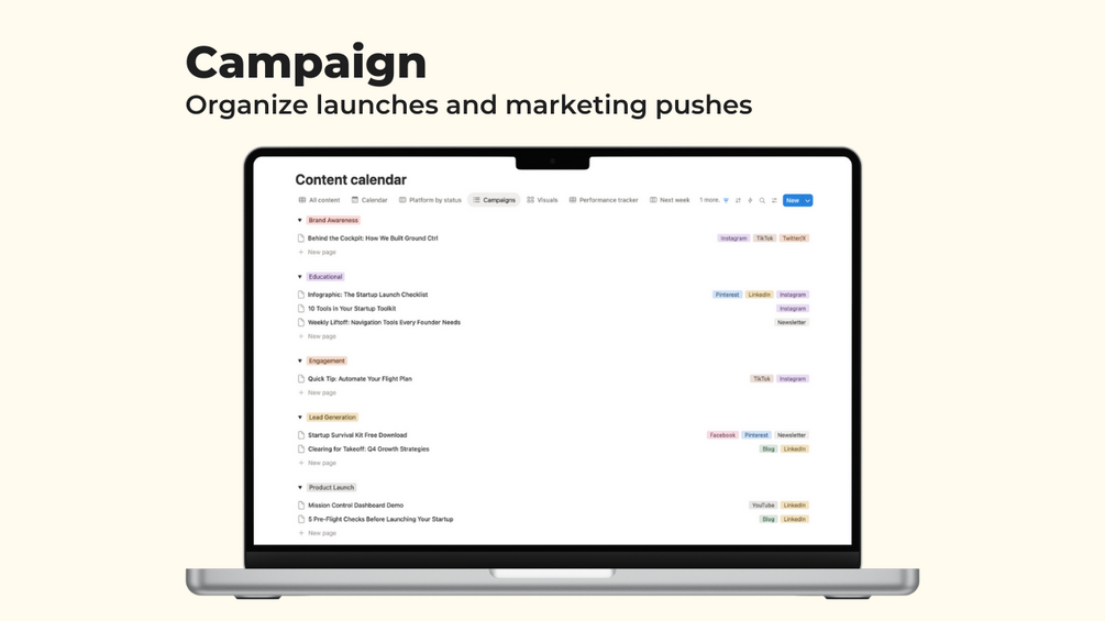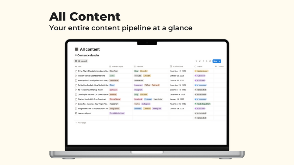 This template is ideal for creators, marketers, and startups who want a clear, repeatable system for managing their content lifecycle.